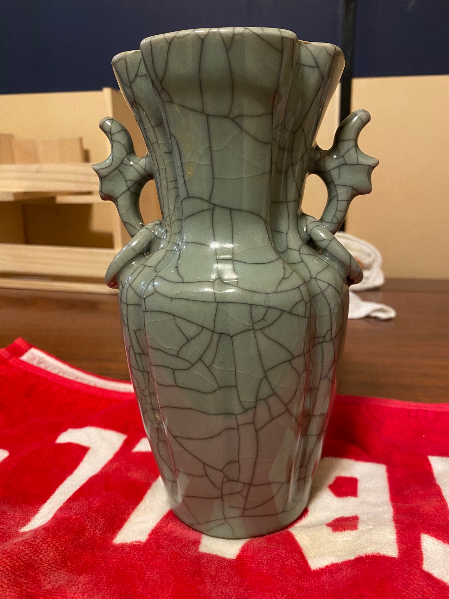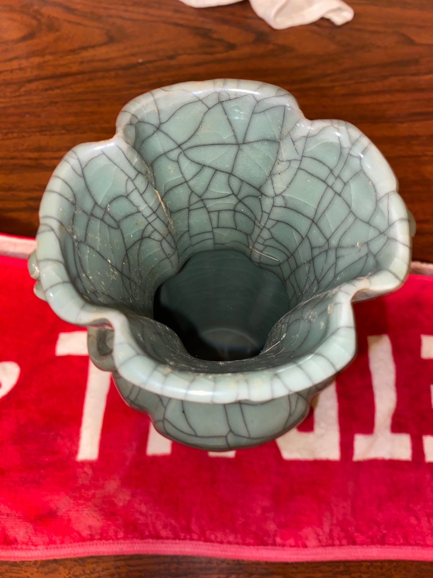 官という文字。 金糸鉄線のようなものが貫入。 双耳、輪花口の形状。 20年以上前から所有。