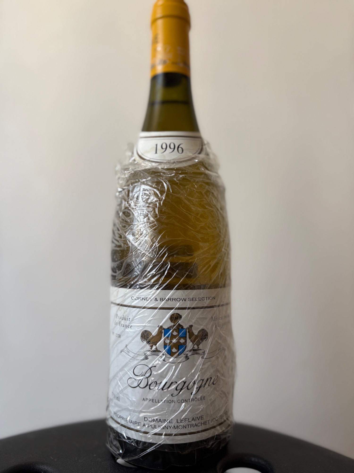 ドメーヌルフレーヴ、ブルゴーニュブラン1996です。所有から約5年、ワインセラーにて保管。目立った液面低下なく、エチケットの状態も良好です。