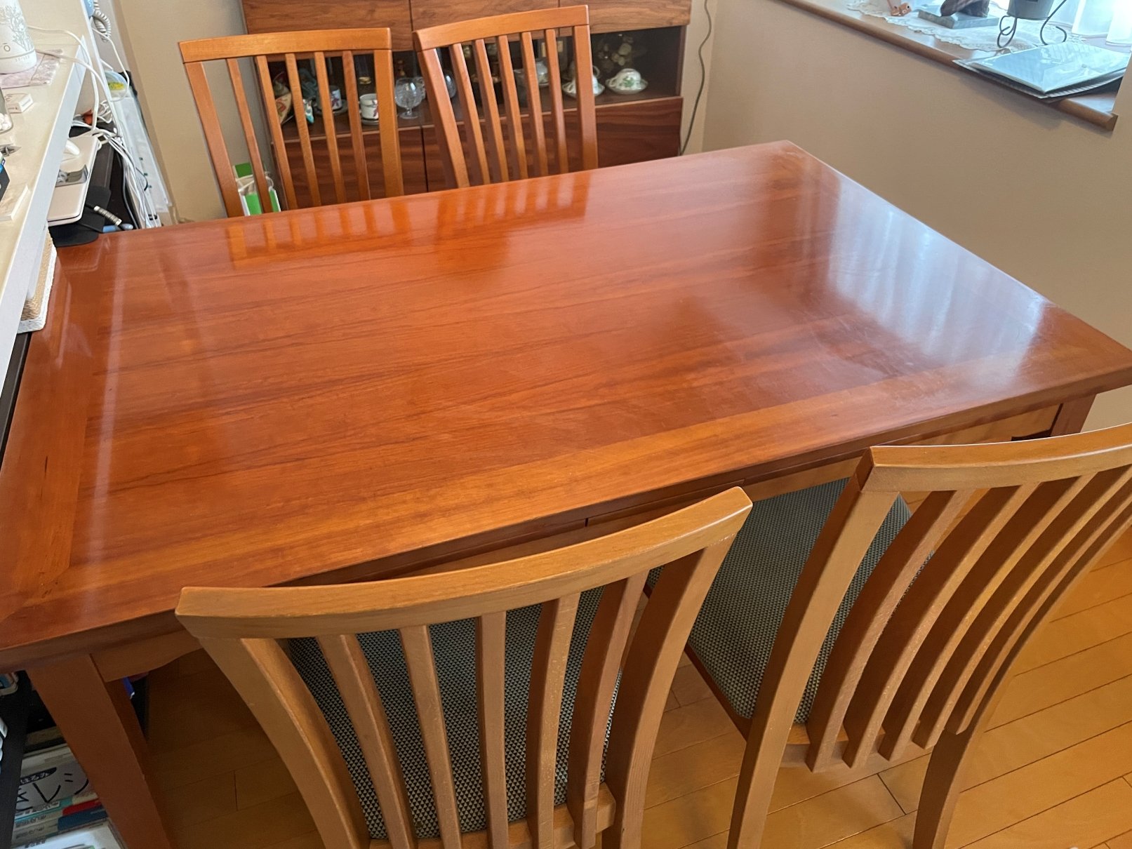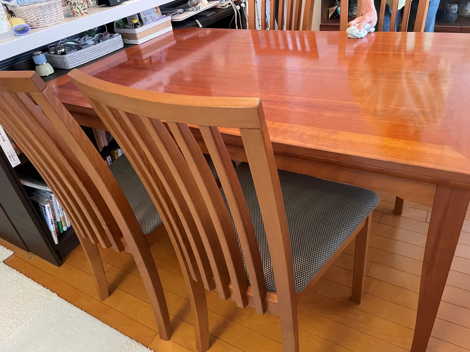 型番はテーブルがSM76で伸縮式、チェアがSM66×4脚です。20年以上使用しておりテーブル面にはキズが付いていますが、チェアは座面にもカバーをつけて使用していたのでキレイな状態かと思います。