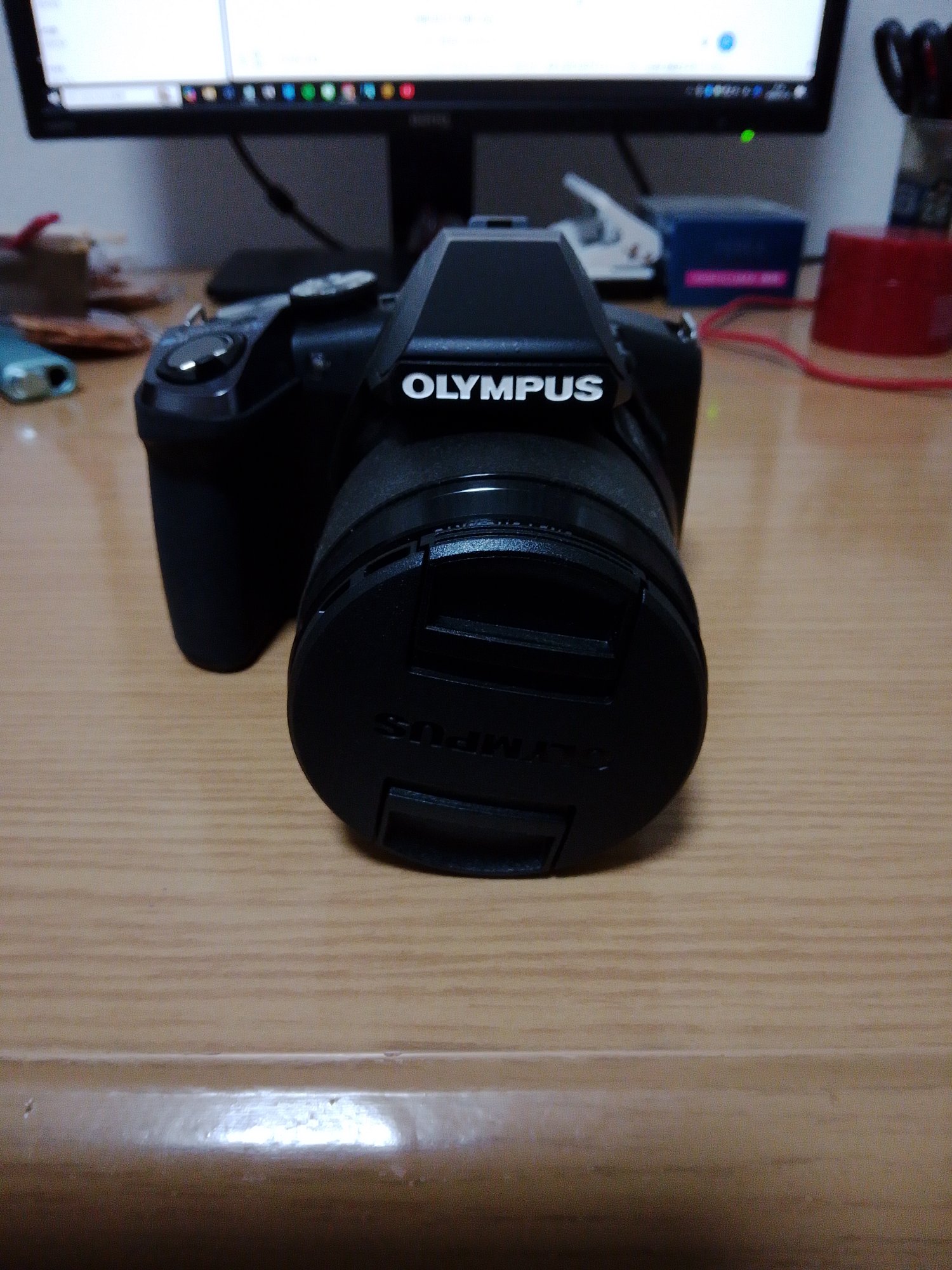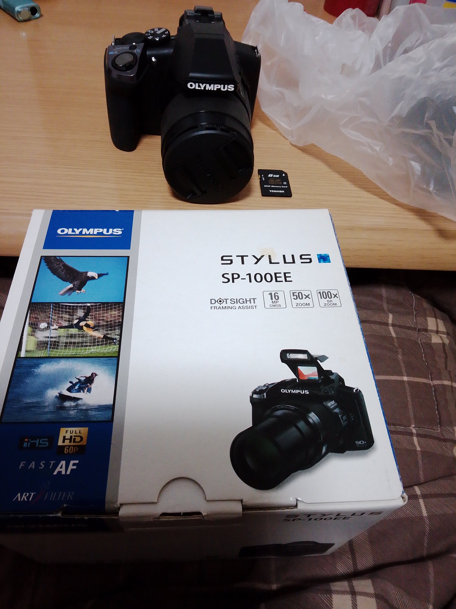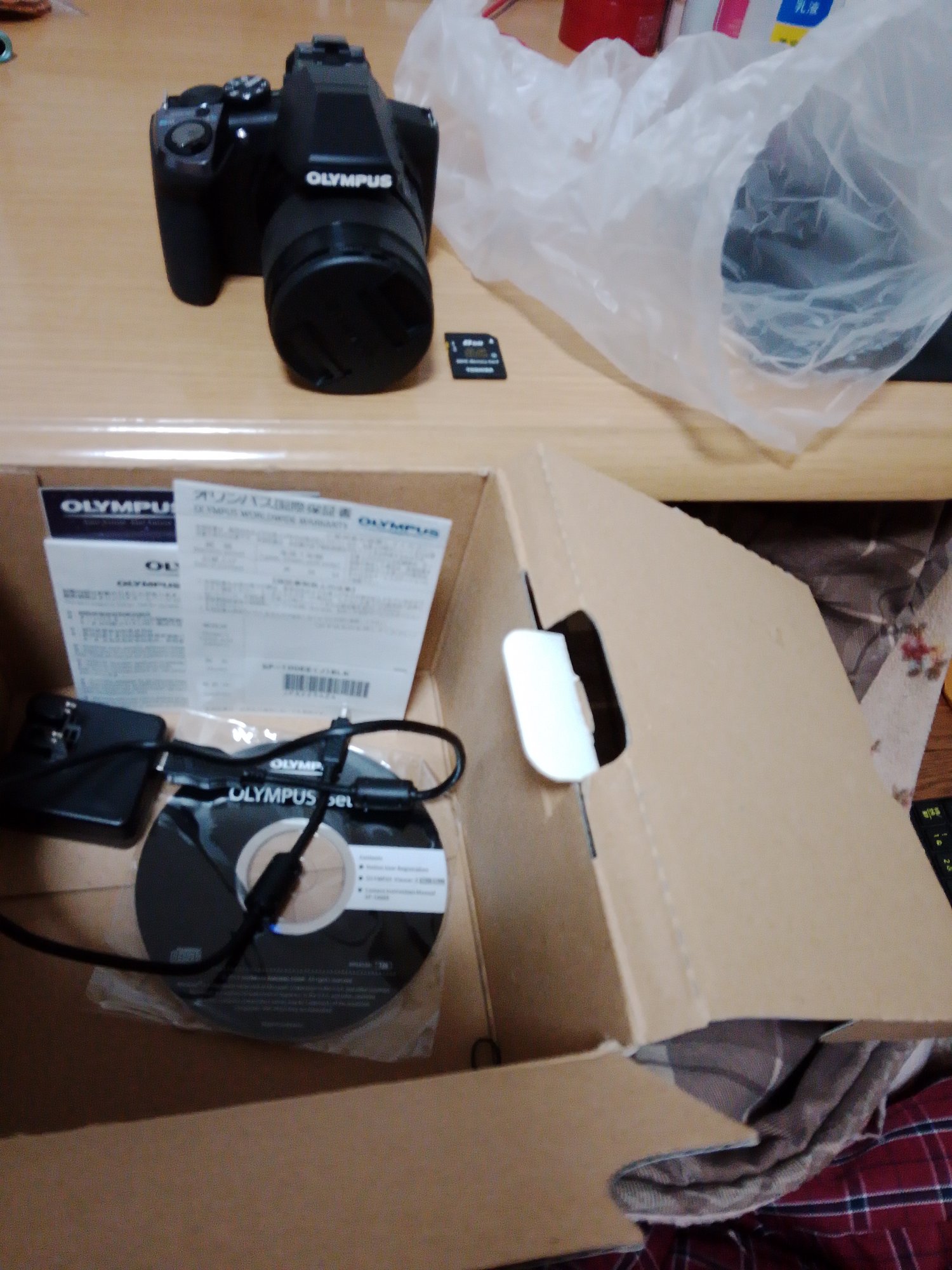 箱あり、純正バッテリーあり、レンズキャップあり、保証書付き、セットアップCDあり。使用頻度は低く、目立つ傷はありません。