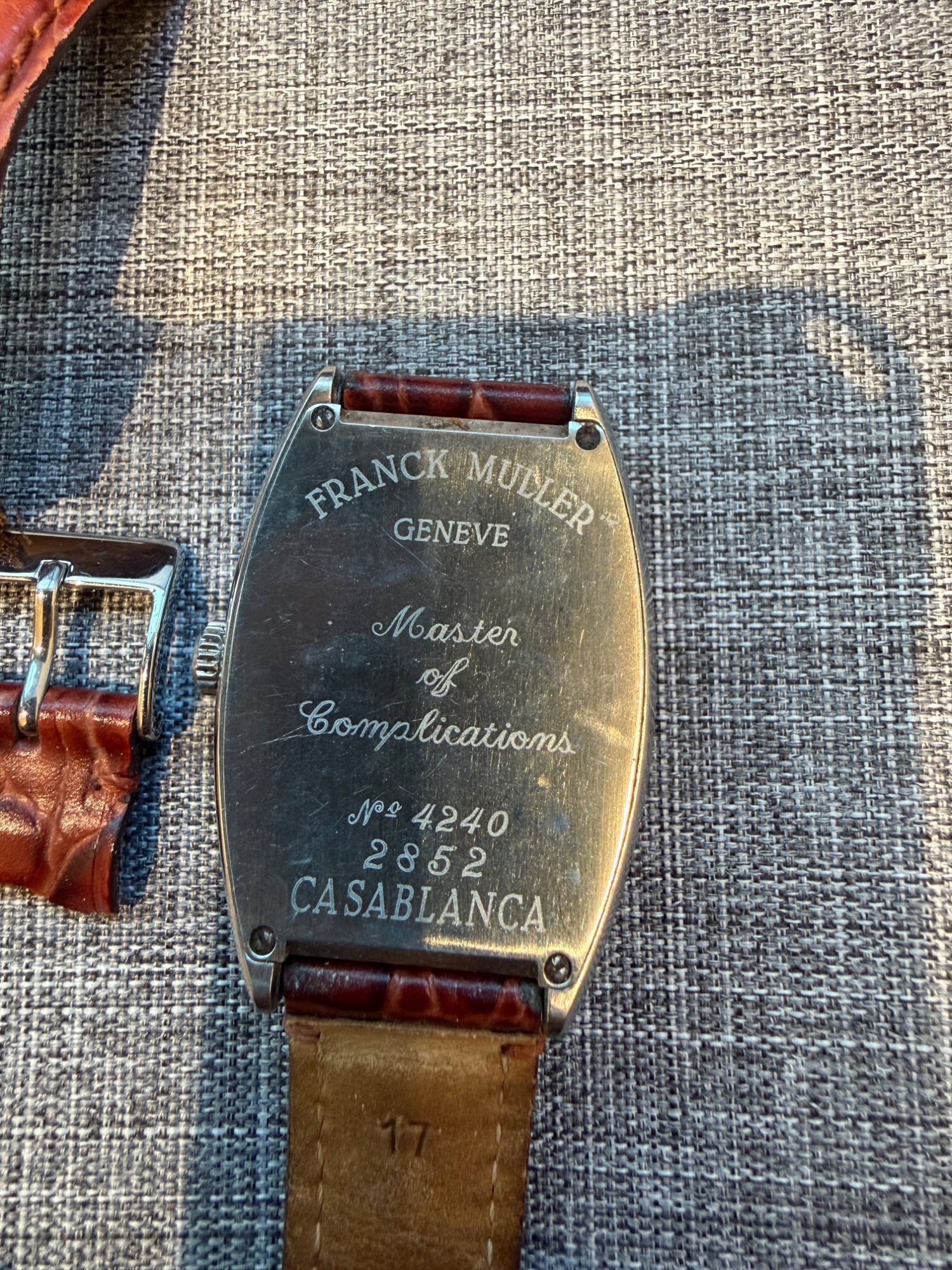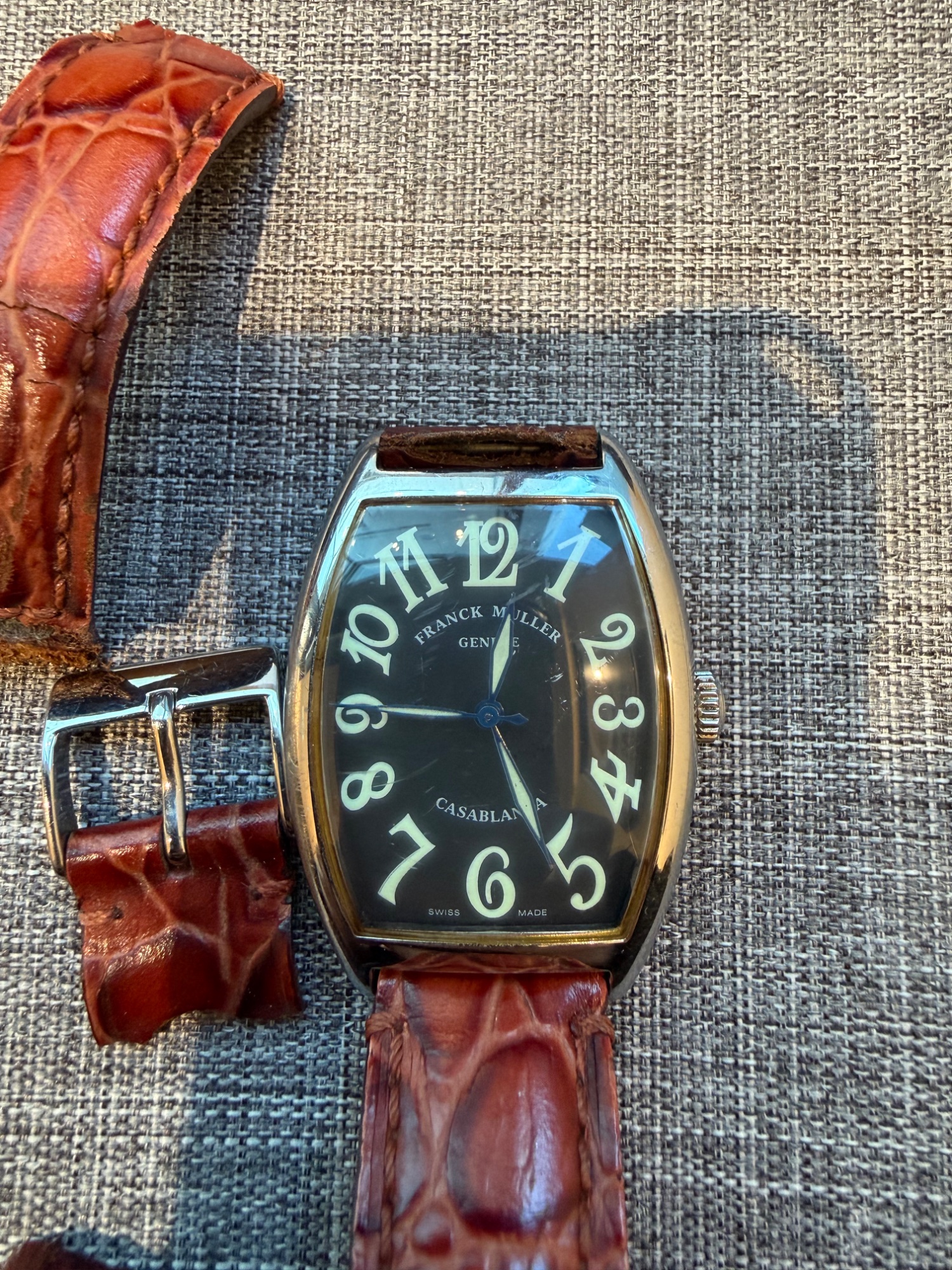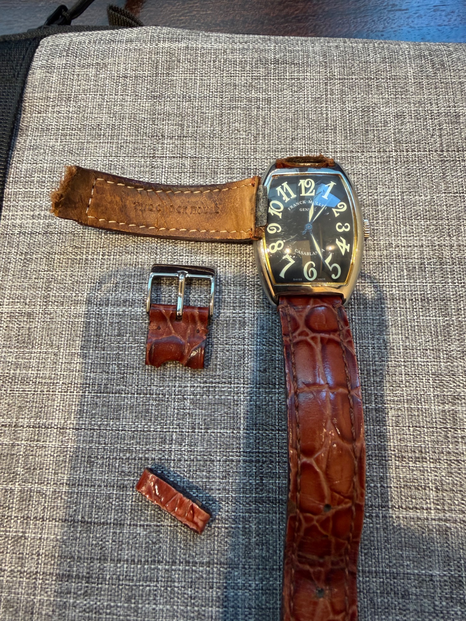 フランクミュラーのカサブランカ(2852)です。自動巻きで現在も元気に動いています。 ベルトが劣化してちぎれていますが、純正の尾錠(金具)は揃っています。 保証書はないので、現状での精一杯の査定をお願いします。
