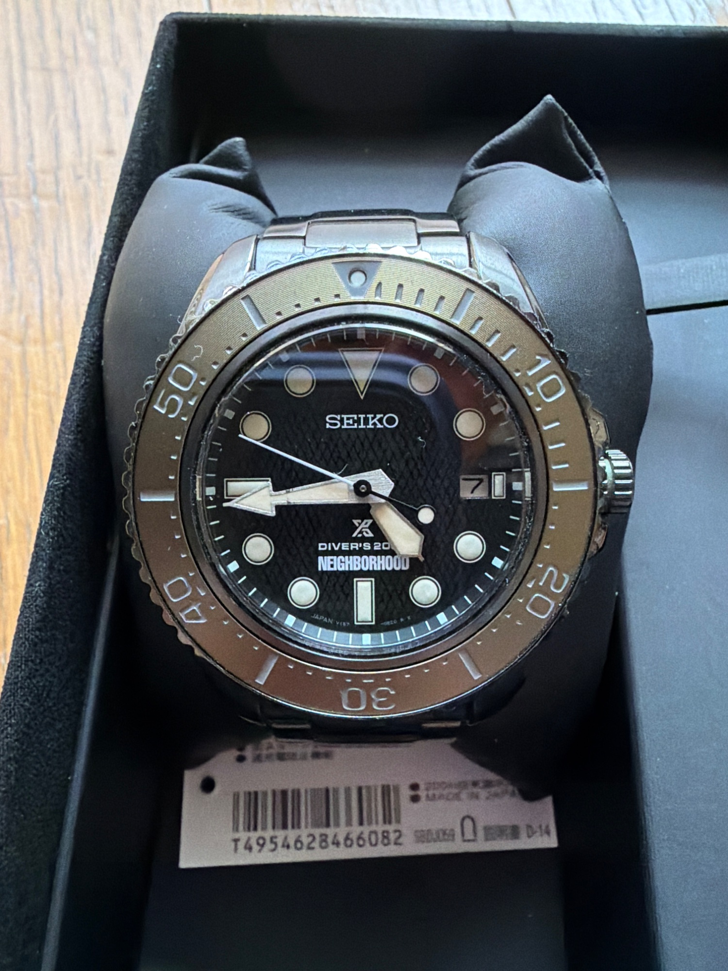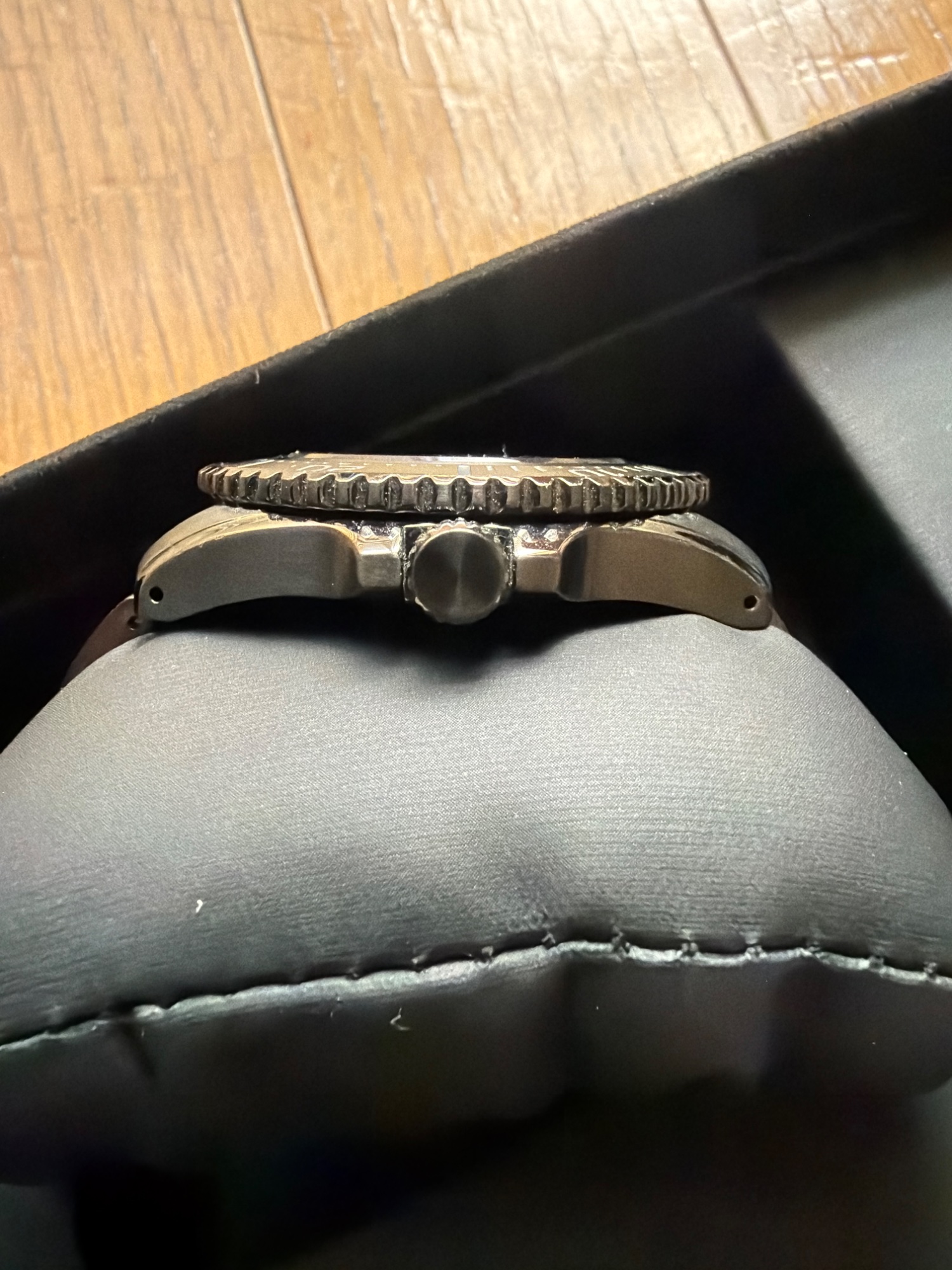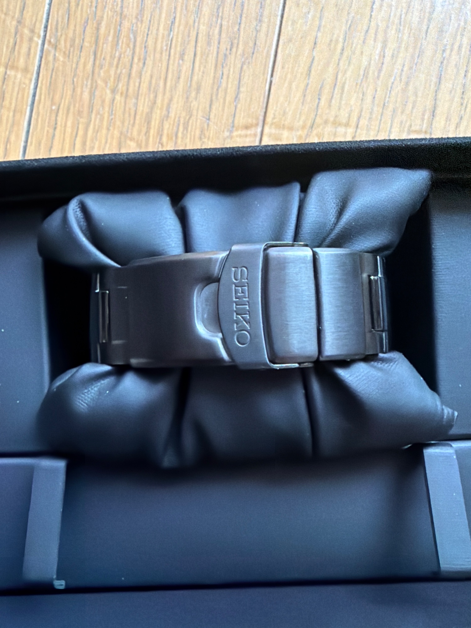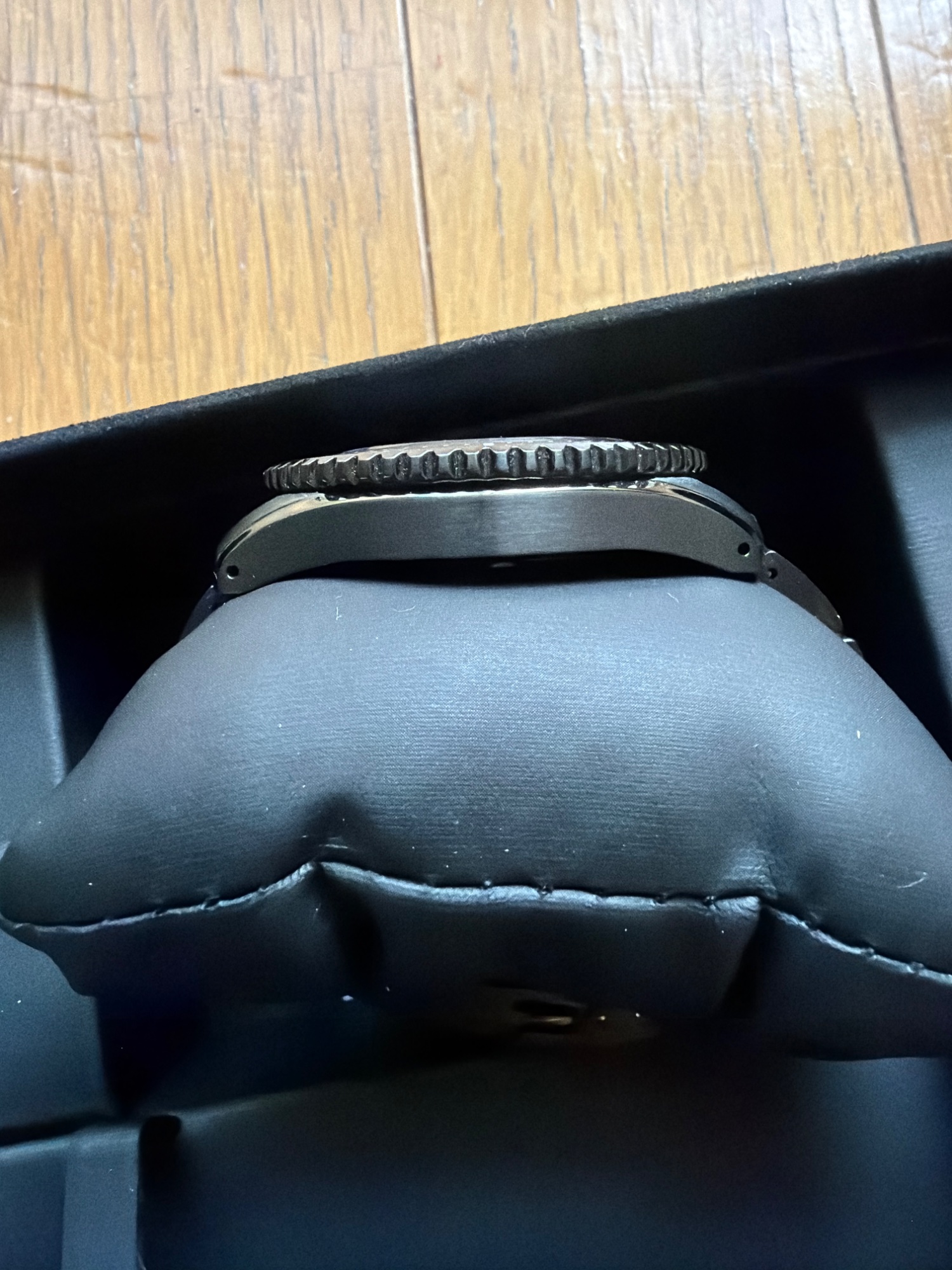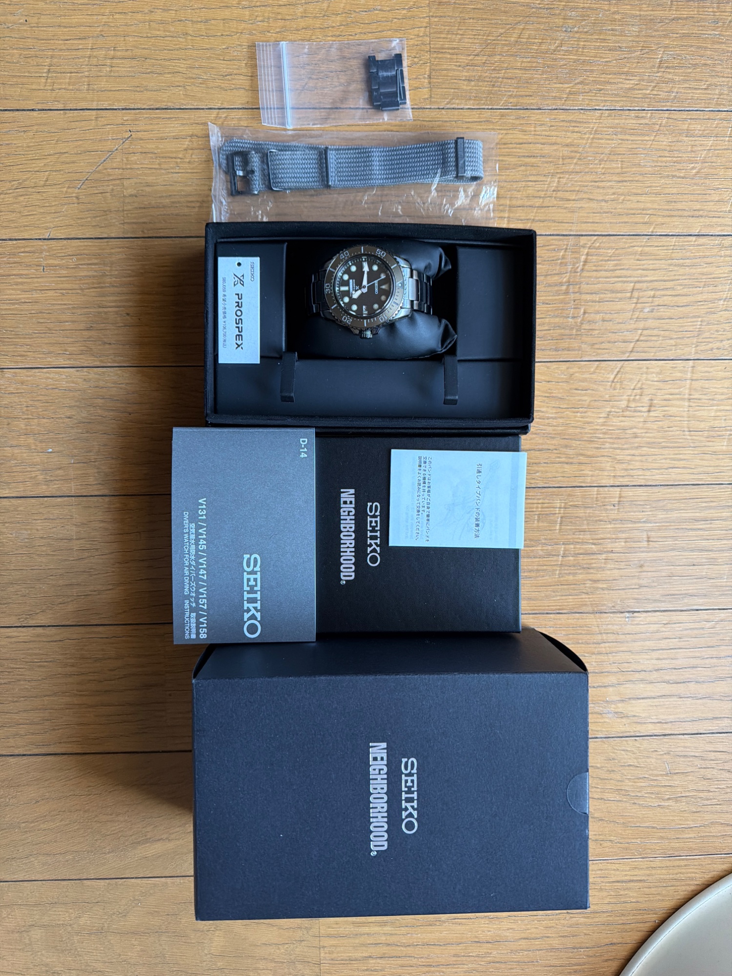 外箱、内箱、保証書、説明書、替えバンド(使用感あり)、ケース自体に目立つ傷はありません。分針に購入時から傷のような線があります。