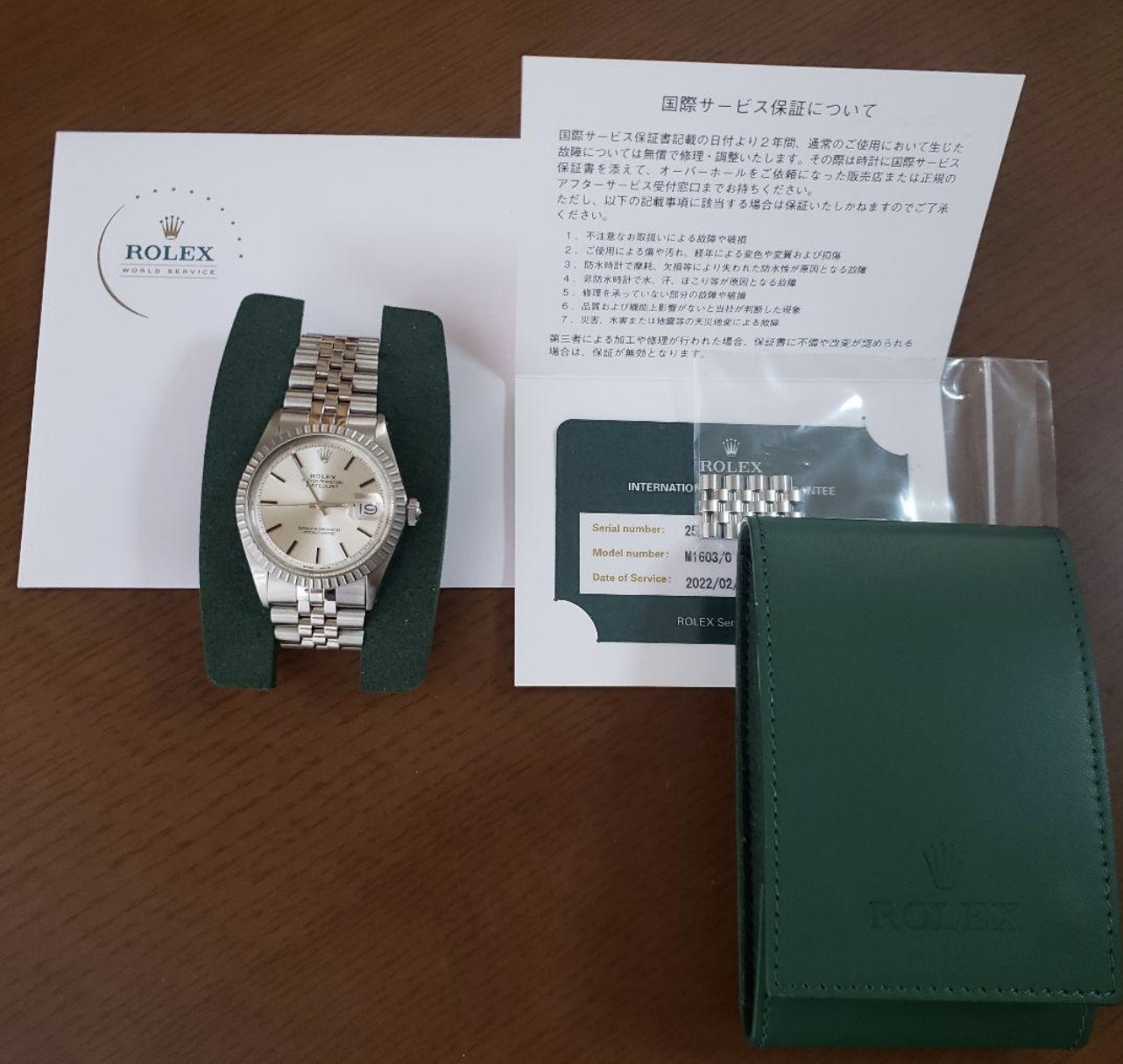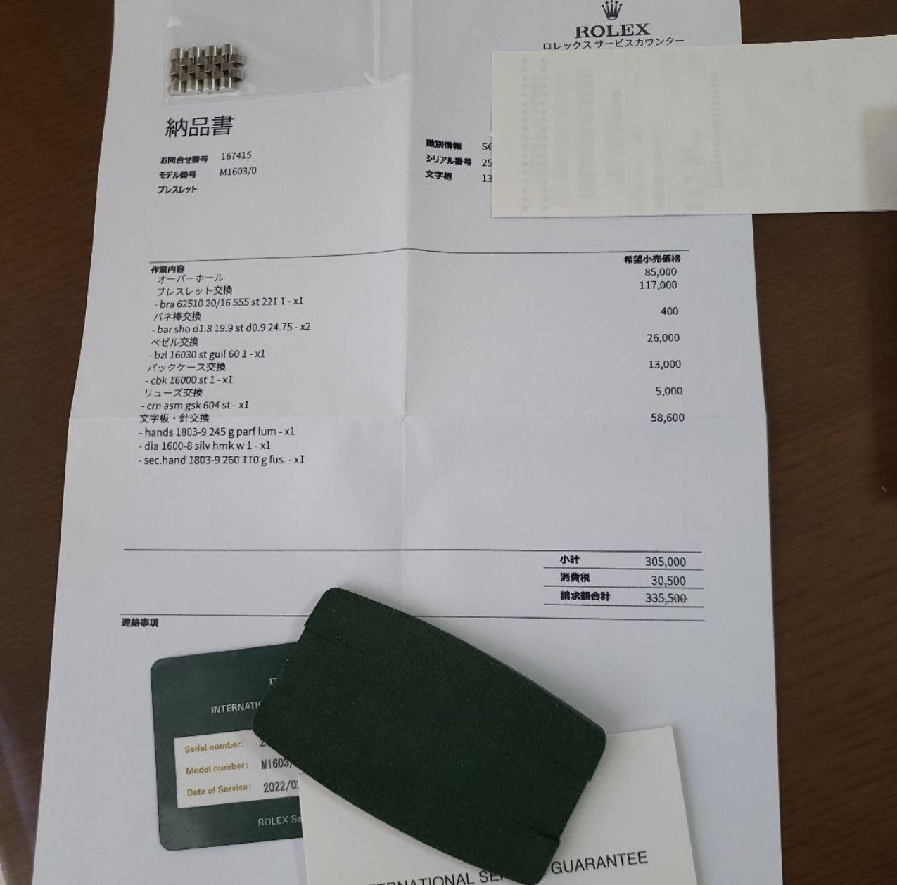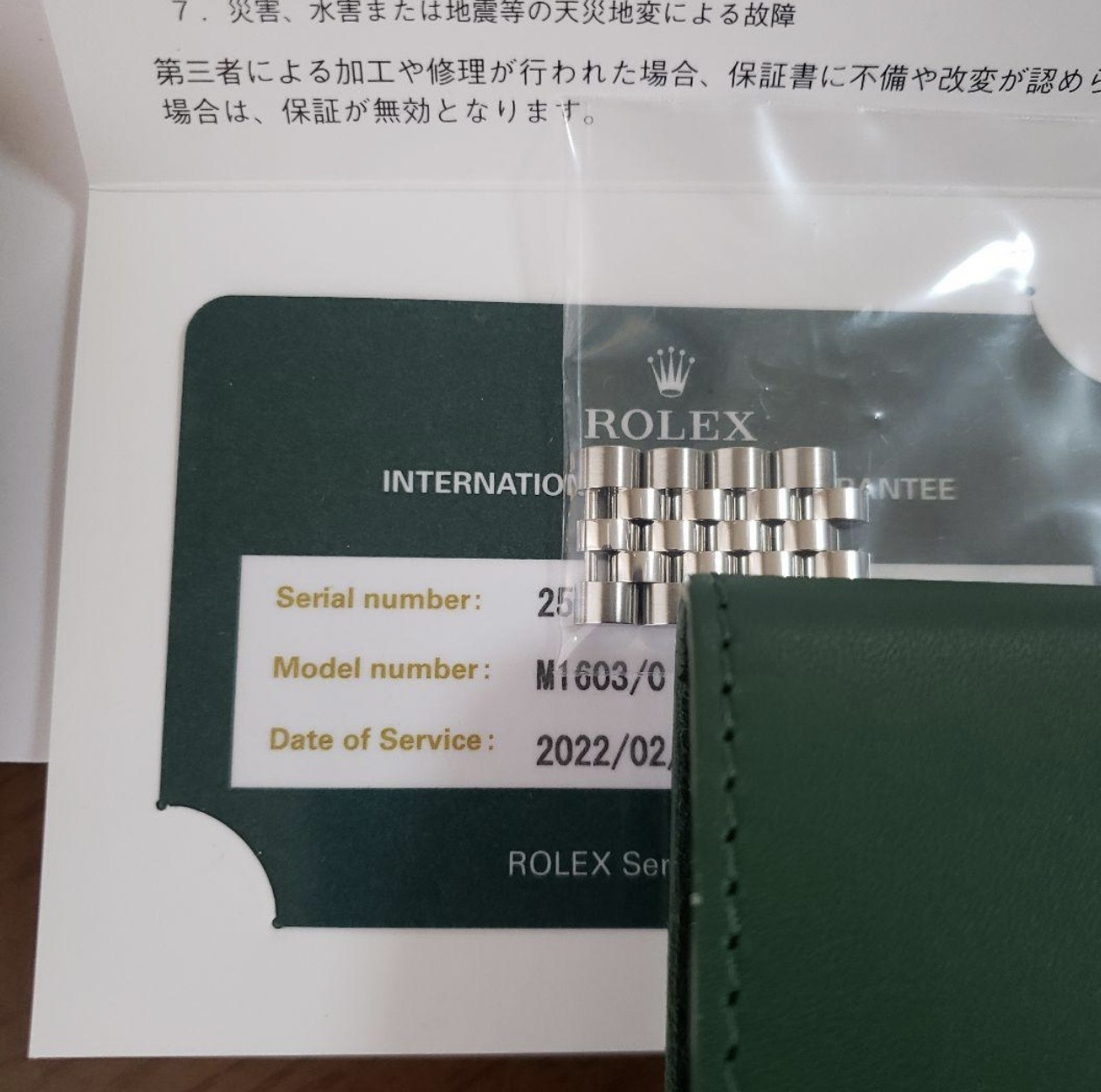 付属品 時計、残りコマ、国際保証ギャランティ、2022年日本ロレックス整備明細、整備時のレシート