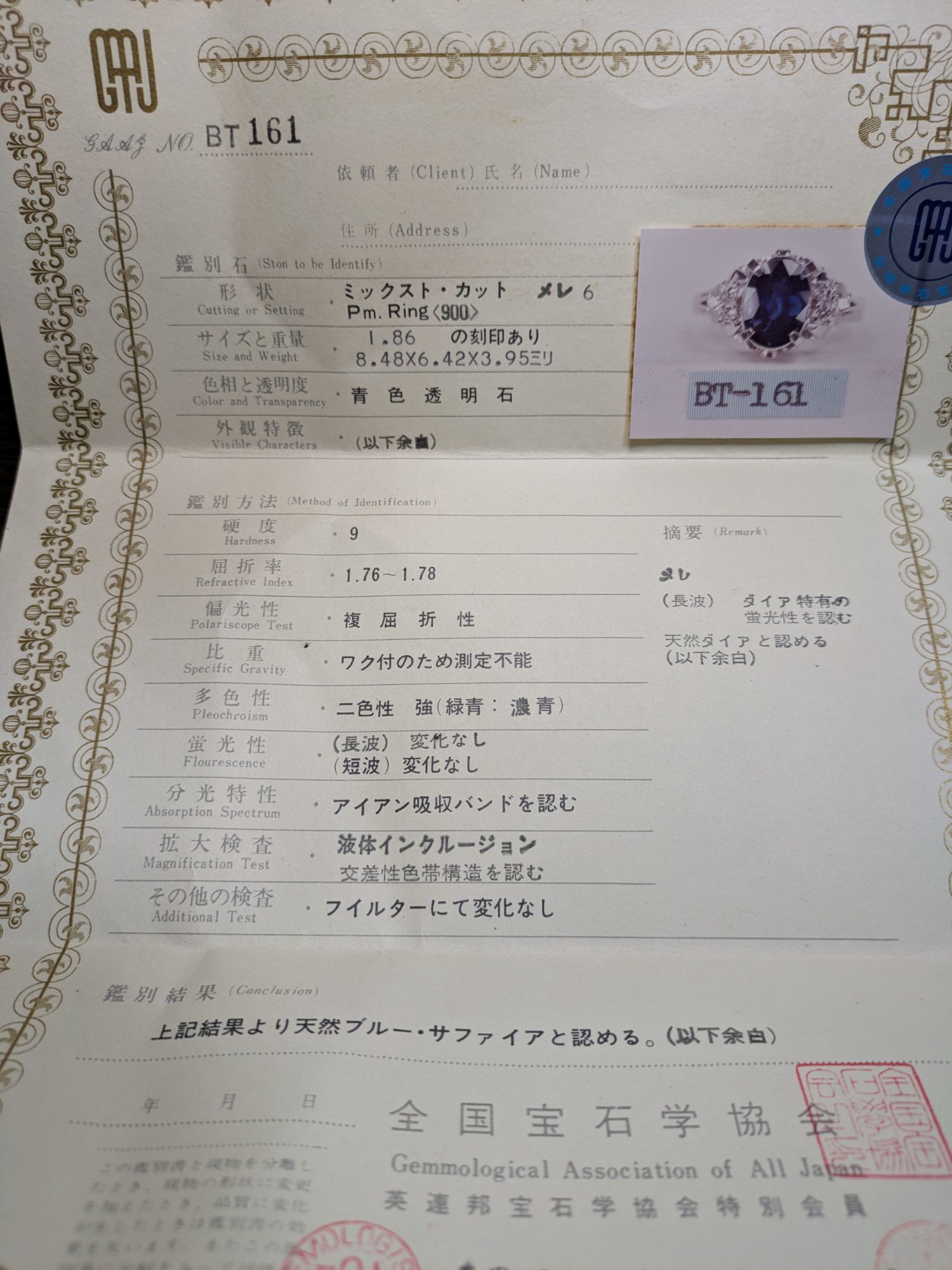 指輪 天然ブルーサファイア1.86ct メレ6天然ダイヤ 鑑別書あり。