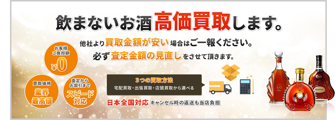 迅速査定が自慢◎古酒や洋酒、ワインなどお酒の買取専門店!◆手数料・出張費・査定料は無料◆1本からでも買取OK!選べる5つの査定方法と3つの買取方法◎お支払いは即日対応!スピード対応が好評◎o。・―――――――――――――――――・。o◎ お酒買取専門ならではの査定額に自信あり! 丁寧・スピーディーに対応します◎◎o。・―――――――――――――――――・。o◎◎お酒を頂いたけど飲めない…◎ワインセラーの中を整理したい…◎他店では買取できないと言われた…◎いらないお酒を売って新しいお酒を購入したい!そんな方はぜひ当店をご利用下さい。ご自宅や倉庫に眠っているお酒や、飲まないお酒などを高価買取します。お気軽にお持ち下さいませ。★その場で即現金化!スピーディーな対応が好評!―・―・―・―・―・―・―・―・―・―・―・―・―・―・―・―査定経験の豊富なスタッフが、査定依頼から、宅配・出張買取の日程対応、お買取完了までスピーディーに対応します◎・・*・・・・・・・・・・・・・・・・・・・・・・・・・・・・・・・・・・・・・・【安心と高価買取】をモットーに、サービス向上に努めております。初めてお酒の買取依頼しようと思っている方、長年収集してきたお酒コレクターの方もどうぞ安心してご利用下さいませ。あなたの大切なお酒、豊富な知識と経験を持つ買取査定専門スタッフが1本ずつ丁寧に心を込めて査定します。・・*・・・・・・・・・・・・・・・・・・・・・・・・・・・・・・・・・・・・・・・\皆様のご依頼、心よりお待ちしております/