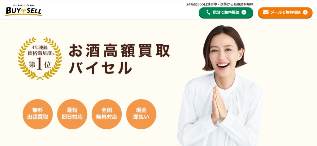 | バイセル【PR】 | 詳細へ電話する | ★★★★☆4.8 | 4年連続価格満足度第1位 | ○ | ○ | ○ | あり | 宮城、埼玉、千葉、東京、神奈川、愛知など | 全国 | 年中無休(問い合わせ) | 24時間(問い合わせ) | お酒、ブランド品、ジュエリーなど | 第301041408603号 |