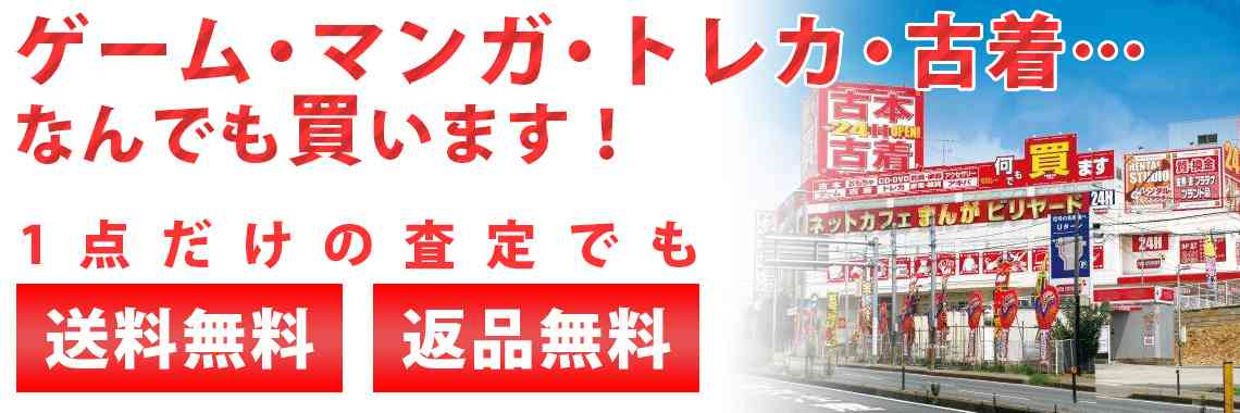 | 買取ジャンル | ブランドバッグ、ゲーム機本体・ゲームソフト、トレカ、CD・DVD、古本、スマホ、高級時計、フィギュア・プラモデル、ミニカー・ラジコン、PC・タブレット、ブランド財布・小物、電動工具・農機具・業務用機械、ピアノ・楽器・PA機材、お酒、その他のおもちゃ、喫煙具 |