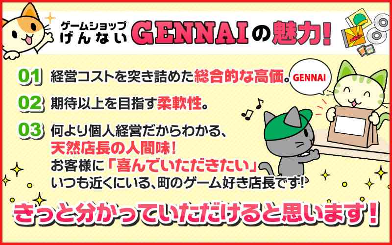 ゲームショップGENNAIは、ゲーム、DVD・ブルーレイを取り扱っている個人経営の店舗です。商品の買取にサービスではなく、対等な取引という関係を持ちながら買取を行っているお店であり、個人経営ならではの誠実な対応が魅力的です。高価買取は他店に負けない自信があり、一部を特別高価、他は安くという買取はしないで、100円以下以外全ての商品に大幅な価格を底上げを加えるという総合して高価な価格を行っています。