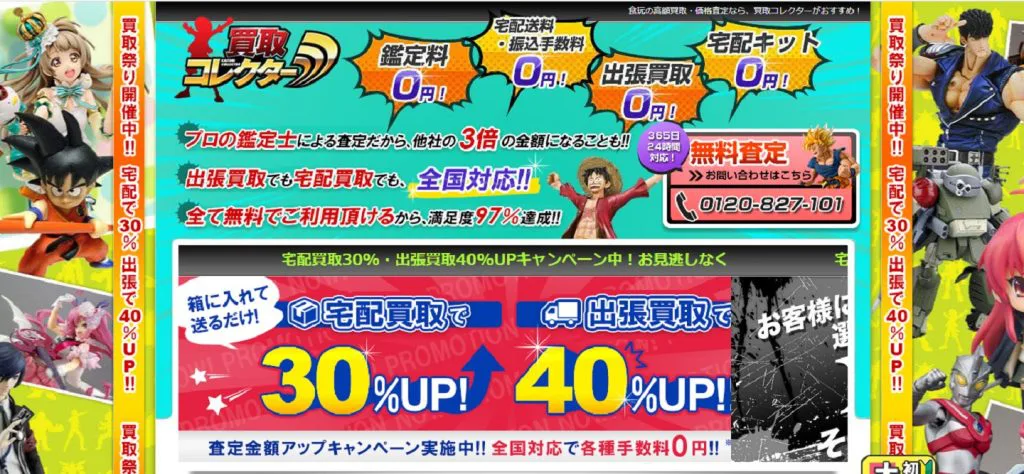 | 買取コレクター | ★★★★☆4.5 | 買取額アップキャンペーンあり | ○ | ○ | – | あり | – | 全国 | 年中無休(問い合わせ) | 24時間(問い合わせ) | 食玩、フィギュアなど | 第305571208721号 |