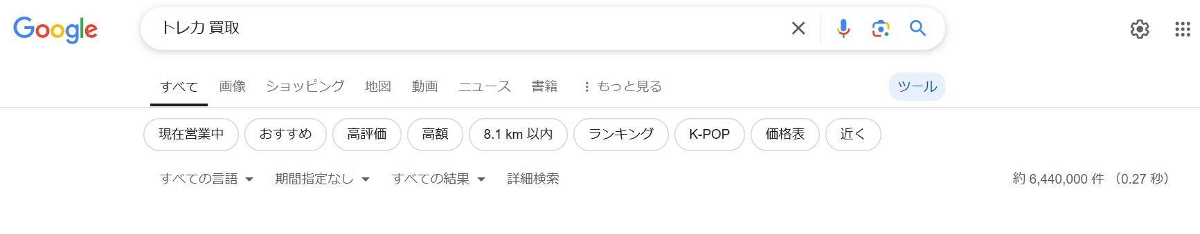 Googleで「トレカ 買取」と検索すると、640万件ほどの検索結果があり、買取店のページや多くの記事が出てきます。