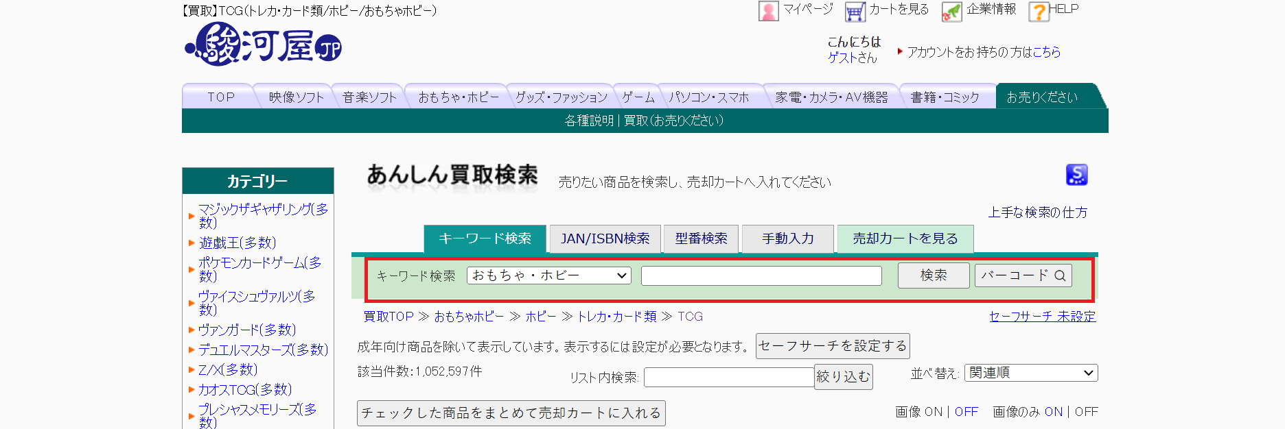 また、カード関連のおもちゃやぬいぐるみなども買取の対象になっている場合があります。これも、商品検索で調べましょう。