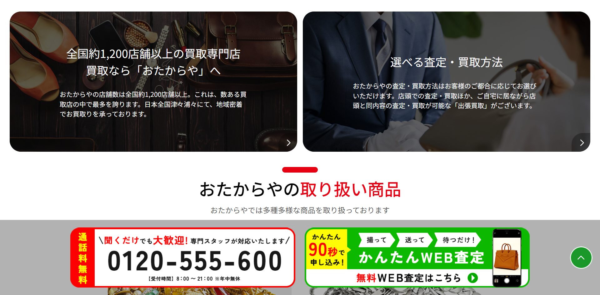 おたからやは、全国に1,200店舗以上を展開する買取業者です。買取品目も時計・ブランド品など豊富にあり、経験豊富な査定士が担当します。