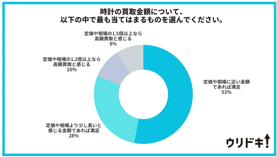 以下の円グラフは、ウリドキ株式会社が買取を成立させた経験がある男女100人に実施した、時計の買取金額ついての満足度のアンケート結果です。