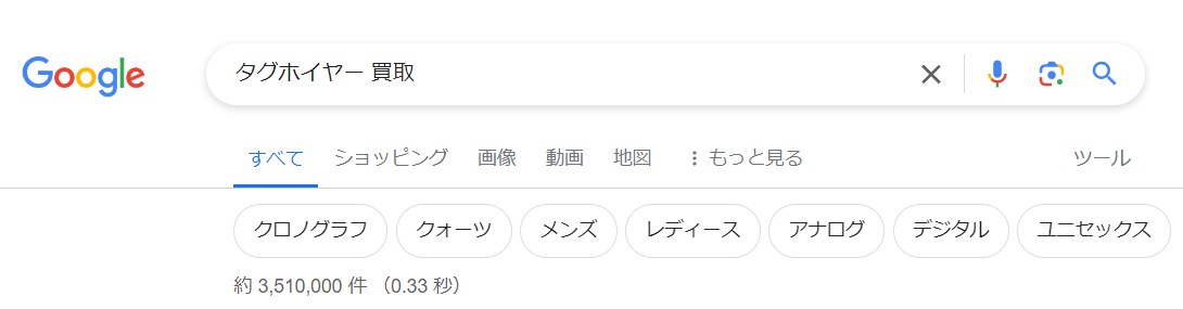 Googleで「タグホイヤー 買取」と検索すると、351万件ほどの検索結果があり、買取店のページや多くの記事が出てきます。